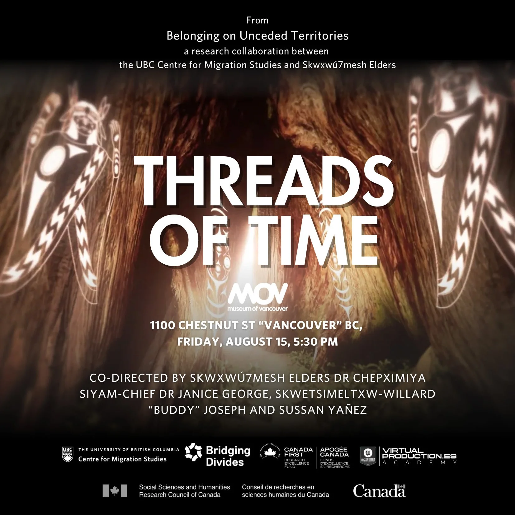 The film screening of Threads of Time is a community space and conversation that explores Indigenous storytelling, memory, and belonging on Unceded lands. Emerging from relational practices and Indigenous sovereignty, Threads of Time bridges traditional story and digital expression, centering a short film created with the direction of Sḵwx ̱ wú7mesh Úxwumixw (Squamish Nation) Dr. Chepximiya Siyam, Dr. Hereditary Chief Janice George and Skwetsimeltxw, Elder Willard “Buddy” Joseph. This is the first in a three-part film series, as we continue working alongside with the xʷməθkʷəy̓əm (Musqueam) and səl̓ilw̓ətaʔɬ (Tsleil-Waututh) Nations. The event invites viewers to reflect on land-based histories, relational ethics, and the power of visual storytelling to carry ancestral knowledge forward.