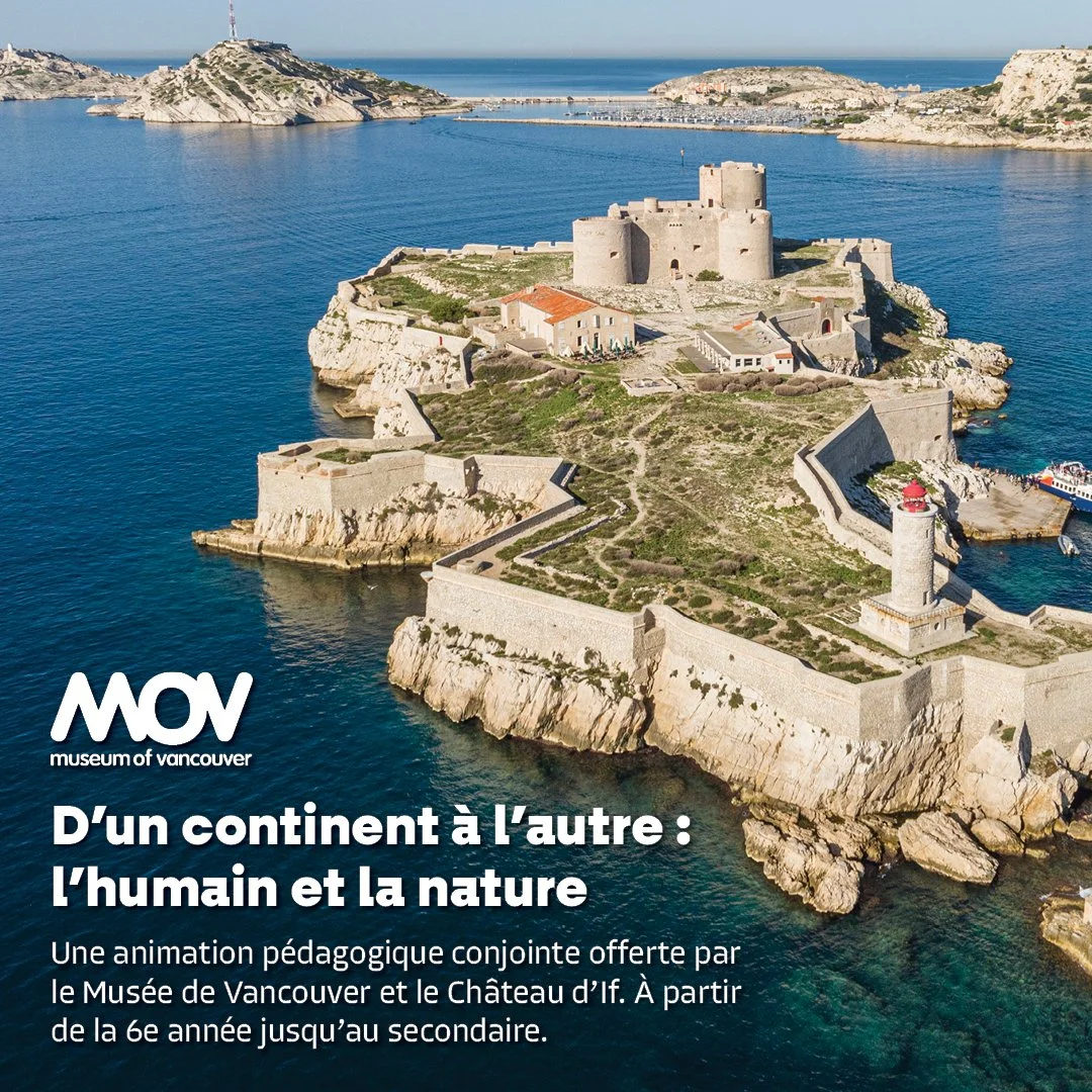 Participez à une activité autonome sous forme de jeu de piste en parcourant l’exposition That Which Sustains Us. Apprenez-en davantage sur les thèmes de la biodiversité, du changement climatique et de la pollution de l'eau induite par l'activité humaine. En parallèle, vous aurez le choix d’opter pour une visite guidée immersive en ligne du Château d’If en anglais ou en français. Comparez comment les lieux géographiques et la culture ont influencé les choix humains dans chaque écosystème, et découvrez des solutions vers un avenir plus durable en France et au Canada !