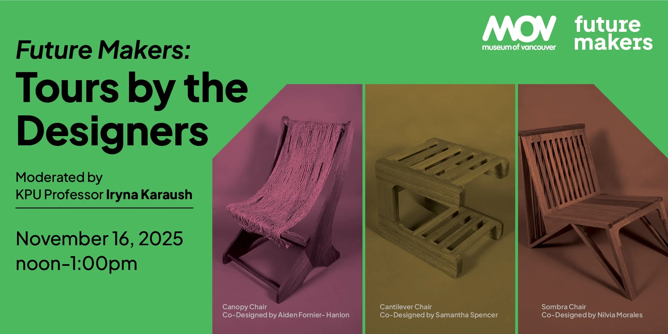 Join us for an exclusive guided tour of Future Makers: Chairs by New Designers, led by the emerging designers from KPU’s Wilson School of Design who created the works on display. They’ll share the inspirations, challenges and processes behind their unique chair prototypes.